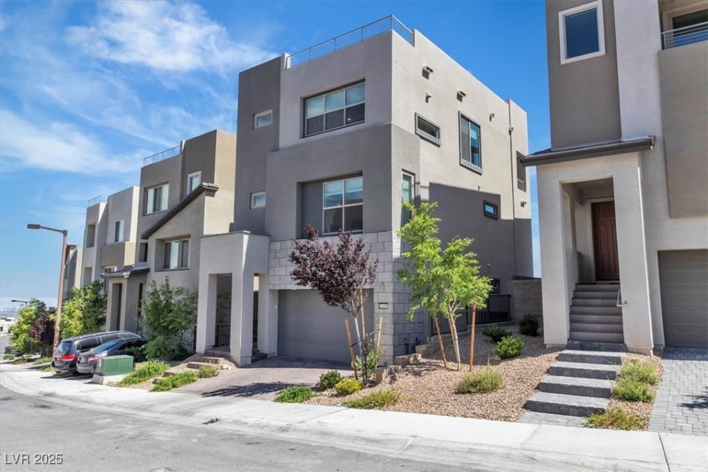 Built in 2023 in highly desirable West Summerlin, this move-in ready home offers 4 bedrooms, 3.5 baths, a 2-car garage, rooftop deck, and spectacular unobstructed views of the Las Vegas Strip, valley, and mountains! Designed for modern living, the flexible floorplan includes a private bedroom and full bath downstairs with its own living area, perfect for guests or multi-gen living. Upstairs features 3 bedrooms including a spacious primary suite with walk-in closet, dual sinks, and large walk-in shower. The top-floor chef's kitchen is the heart of the home with a large island, breakfast bar, stainless steel appliances, and open family room leading to a balcony with stunning Strip views. Go up to the rooftop deck with panoramic valley views (builder indicates potential to extend across entire roof). Additional upgrades include whole-home water treatment system, R/O at kitchen, and tankless water heater. Located near the West Summerlin Community Center with an assumable 5.25% VA loan!