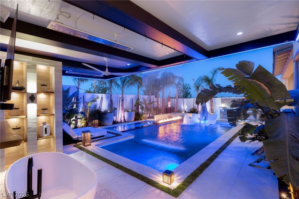 A rare offering in 89138, this extensively upgraded modern residence boasts a backyard designed to rival a private Bali resort?created for year-round livability, even in the peak of Las Vegas summers. Set on an elevated corner lot, the outdoor experience is the centerpiece. Lush tropical landscaping surrounds a black PebbleTec pool & spa, enhanced by fine water misters, foggers, built-in heaters, & a sleek aluminum-covered patio extension. Multiple outdoor living areas?including fire pit lounges & a fully equipped outdoor kitchen?create the perfect environment for entertaining or relaxation in every season. Subtle Strip views add to the sense of privacy & elevation. Sustainability is fully integrated w/paid solar, UV-tinted windows, motion-activated lighting, smart irrigation, & 7-stage water filtration & softening. Whole-home Lutron lighting, in-ceiling audio, & advanced smart-home controls allow lighting, climate, & media to be adjusted effortlessly by phone or voice.