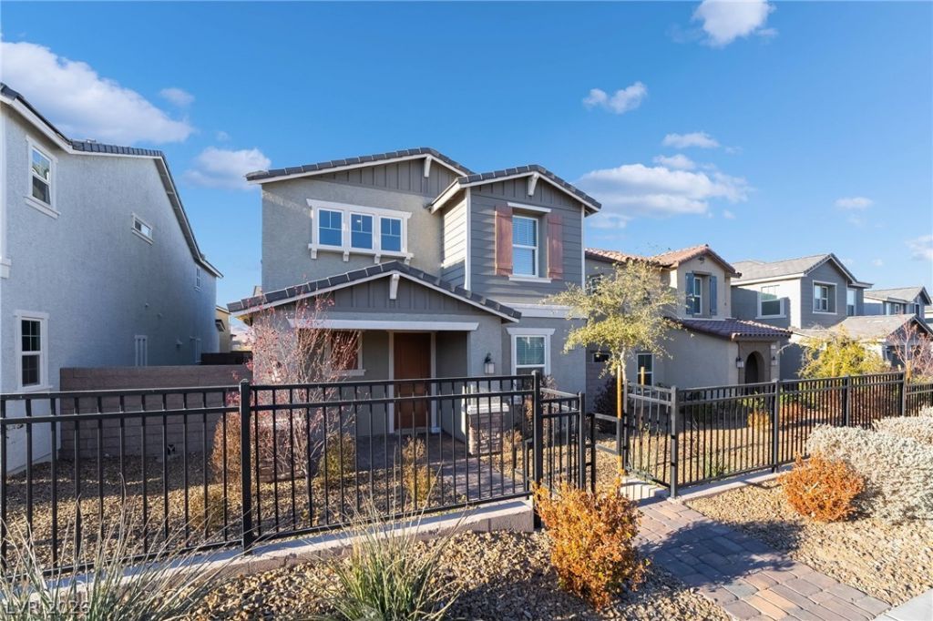 Discover this stunning home in the desirable Inspirada community! Featuring an open floor plan with recessed lighting and sleek tile flooring throughout, this residence exudes modern charm. The fully updated kitchen boasts a contemporary backsplash, stainless steel appliances, custom cabinets, a breakfast bar with seating space, and a pantry. The living room highlights an accent entertainment wall, while the main level offers a bedroom conveniently located near a full bathroom. Upstairs, enjoy the versatility of a spacious loft, along with a luxurious master suite featuring dual sinks, a walk-in shower, and a large walk-in closet. The additional bedrooms provide plenty of space, all complemented by ceiling fans for added comfort. Step outside to a finished backyard with pavers, perfect for relaxing or entertaining.