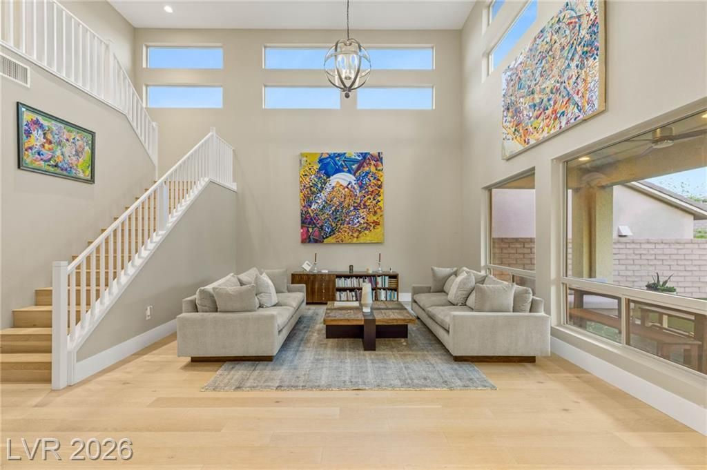 A rare opportunity to own the largest lot and best value in the guard-gated Reverence Heights community of Summerlin. This contemporary two-story home offers 3,901 sq ft, 5 bedrooms, 5 bathrooms, & a 3-car garage, including a full bedroom and bathroom downstairs?ideal for guests or multigenerational living.The open great room features soaring ceilings & abundant natural light, flowing into an updated chef's kitchen w/ stainless steel appliances, apron-front sink, oversized island,& modern finishes. Upstairs includes a spacious loft & a private primary suite with sitting area, fireplace, spa-inspired bath, dual vanities, soaking tub, walk-in shower, & custom closets. Stunning Mountain View's from many bedrooms. Highlights include 2 laundry rooms one upstairs & downstairs, a low-maintenance backyard with artificial turf and covered patio. Minutes from clubhouse and trails. Reverence offers resort-style amenities, scenic trails, and close proximity to Red Rock Canyon & DowntownSummerlin.
