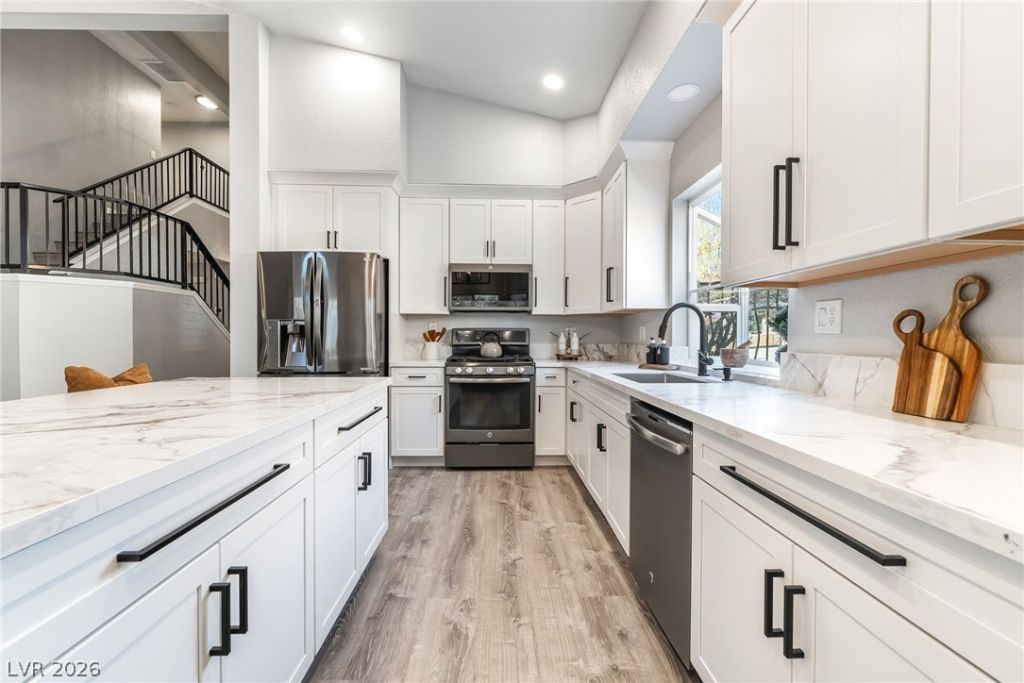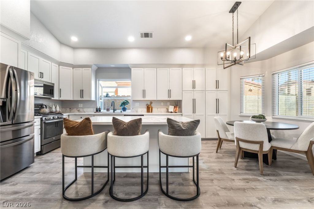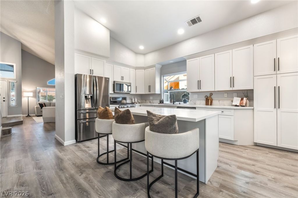 Welcome to the beautifully remodeled home you've been waiting for in the highly desirable Morningside community, this stunning 4-bedroom, 2.5-bath residence offers the perfect blend of luxury, comfort, and functionality. With over $55,000 invested in upgrades to the kitchen and primary suite, no detail has been overlooked. The completely redesigned kitchen is a showstopper, featuring high-end Kitchenland cabinetry, sleek quartz countertops with a spacious island, and stainless steel appliances ? creating an ideal space for both everyday living & effortless entertaining. The primary bedroom, conveniently located downstairs, has been fully renovated into a spa-inspired retreat. Enjoy a beautifully modernized bathroom and a generous walk-in closet. Soaring vaulted ceilings elevate the sense of space across all 2,247sqft of living area. Freshly renovated and move-in ready, this exceptional Henderson pool home combines style, sophistication, and convenience ? all in one incredible package.