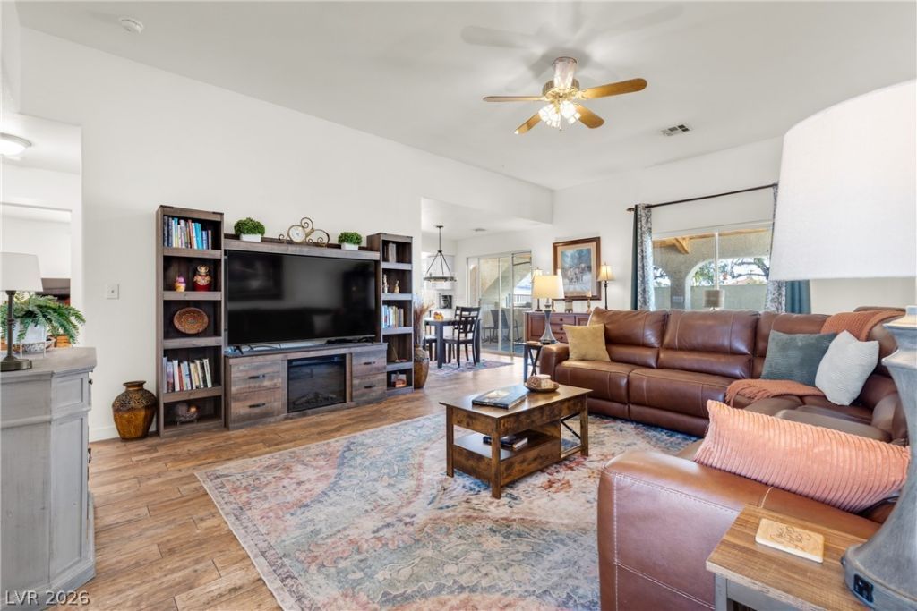 Beautiful and fully remodeled one story home with a pool, possible RV parking and no HOA! This is a 3 bedroom, 2 bath home with Porcelain wood-like tile throughout and a great open floor plan! Backyard has newly installed artificial turf with a putting green and a new shed that stays. The pool area is gated and set off to the side of the home with a separate gate for access for pet and child safety. The covered patio is great for BBQ'ing and entertaining with a game area and a pool table that stays with the home. There is also an upstairs deck with gorgeous views of the strip! This home is gorgeous and you will not be disappointed!