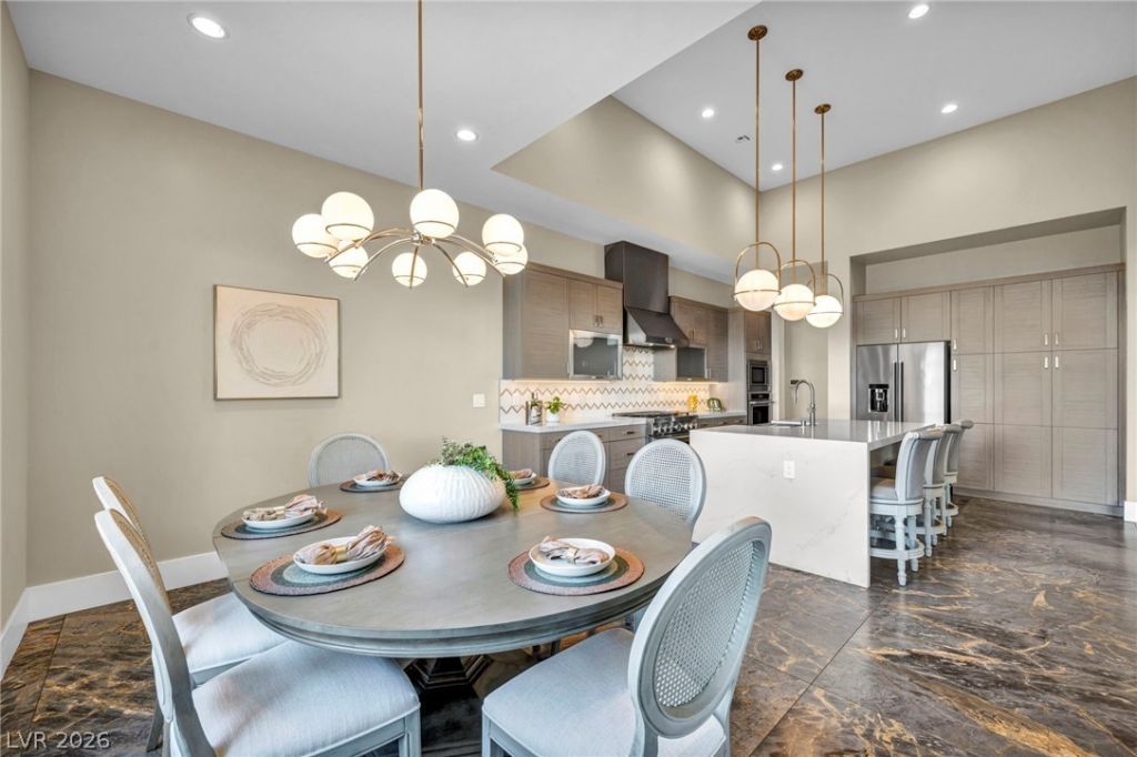 Designer Toll Brothers residence located within the guard-gated Regency community in The Cliffs, South Summerlin. Every detail curated by a Beverly Hills designer using the finest materials throughout. Features include imported porcelain tile, genuine hardwood flooring, high-end shower surrounds, and top-of-the-line carpet with enhanced padding. Elegant European-style cabinetry, luxury KitchenAid appliances, and designer countertops complete the space. The original floor plan was intentionally upgraded to provide additional square footage, enhancing both space and functionality. Maintained as a second home and rarely occupied. The gourmet kitchen features a grand island with a waterfall countertop style, ideal for everyday living and entertaining. Dramatic ceilings, premium paint, marble mosaic inserts, premium hardware and fixtures, and enhanced electrical options further elevate this remarkable home. Minutes from Red Rock Canyon, Downtown Summerlin, and world-class dining.
