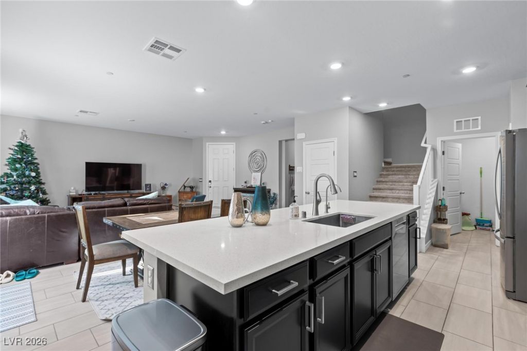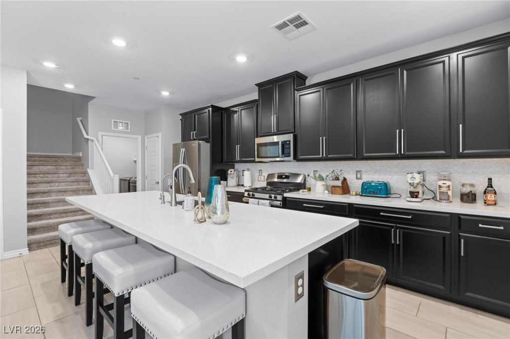 Welcome to this beautifully maintained 2022-built townhouse located in the desirable Roxbury community of North Las Vegas. Offering 1,645 sf. of modern living space, this home features 3 spacious bedrooms and 2.5 bathrooms with a thoughtful open-concept design. The kitchen showcases sleek quartz countertops, beautiful backsplash, stainless steel appliances, a large center island, and ample cabinetry with pulls, perfect for entertaining or everyday living. The adjoining living and dining areas provide a bright and inviting atmosphere. Upstairs, you'll find generously sized bedrooms which one has a walk in closet, including a comfortable primary suite with a private bath. Enjoy the convenience of backyard access, ideal for outdoor relaxation. Additional highlights include a 2-car garage with EV charger plug and energy-efficient construction. Located near shopping, dining, parks, and freeway access, this move-in-ready home combines style, comfort, and convenience in a growing community!
