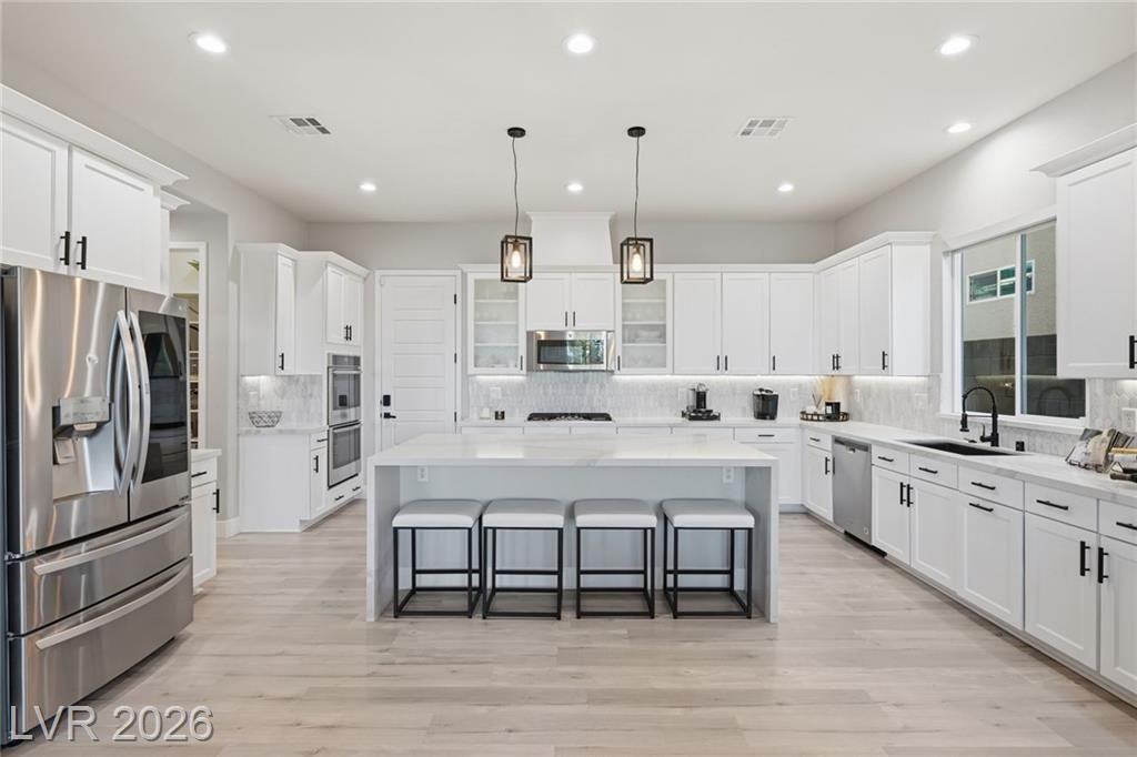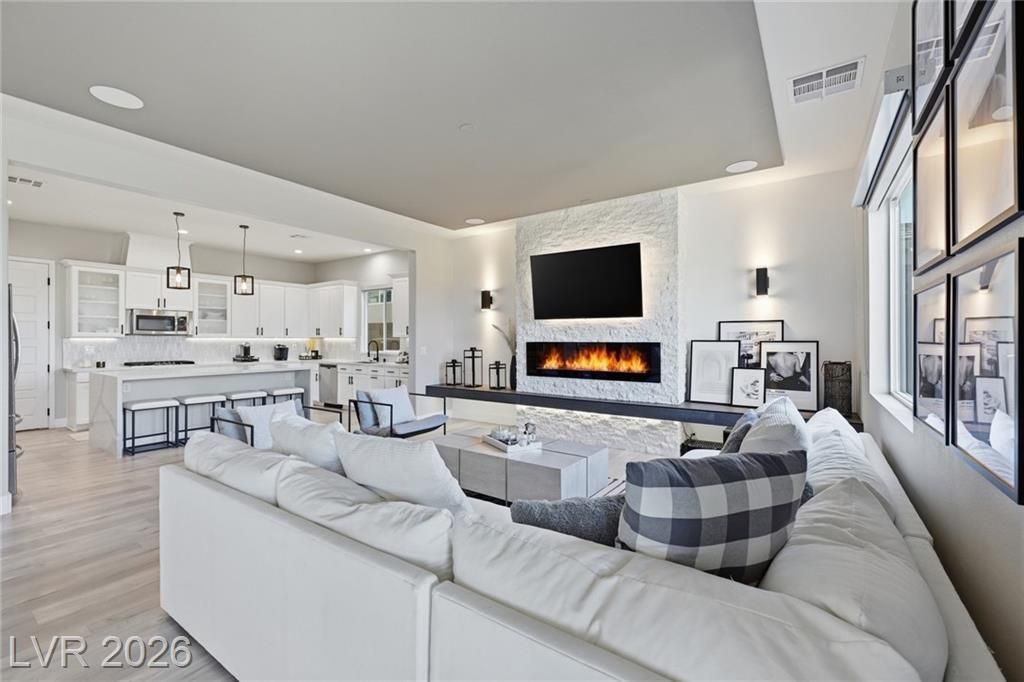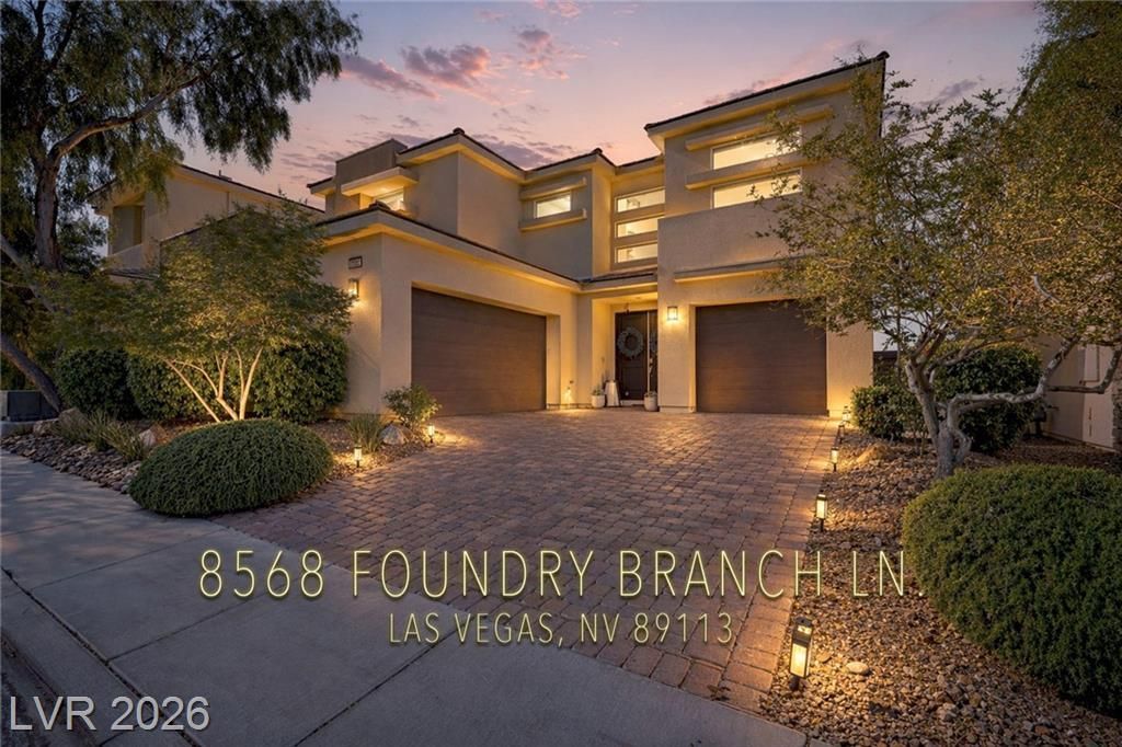 Thoughtfully upgraded modern home in a gated Southwest Las Vegas community offering 4 bedrooms, 3 baths, loft & split 3-car garage. Open-concept floor plan features 10-ft ceilings, wide plank flooring, designer lighting & stunning great room w/ custom floor-to-ceiling stone fireplace wall, linear electric fireplace and built-in surround sound. Gourmet kitchen includes waterfall-edge quartz island, shaker cabinetry, black hardware, double ovens, farmhouse sink and large walk-in pantry. Flexible layout includes full bedroom and bath downstairs for possible generational living plus spacious loft with custom built-ins. Primary suite offers soaking tub, oversized walk-in shower and custom closet system. Backyard retreat features covered patio with rolling shutter, spa, fountain, synthetic turf, dog run and paver hardscape. Epoxy garage floors, premium whole-home water filtration, tankless water heater and ideal proximity to 215, Durango Resort, shopping, dining and more. Contact us to view.